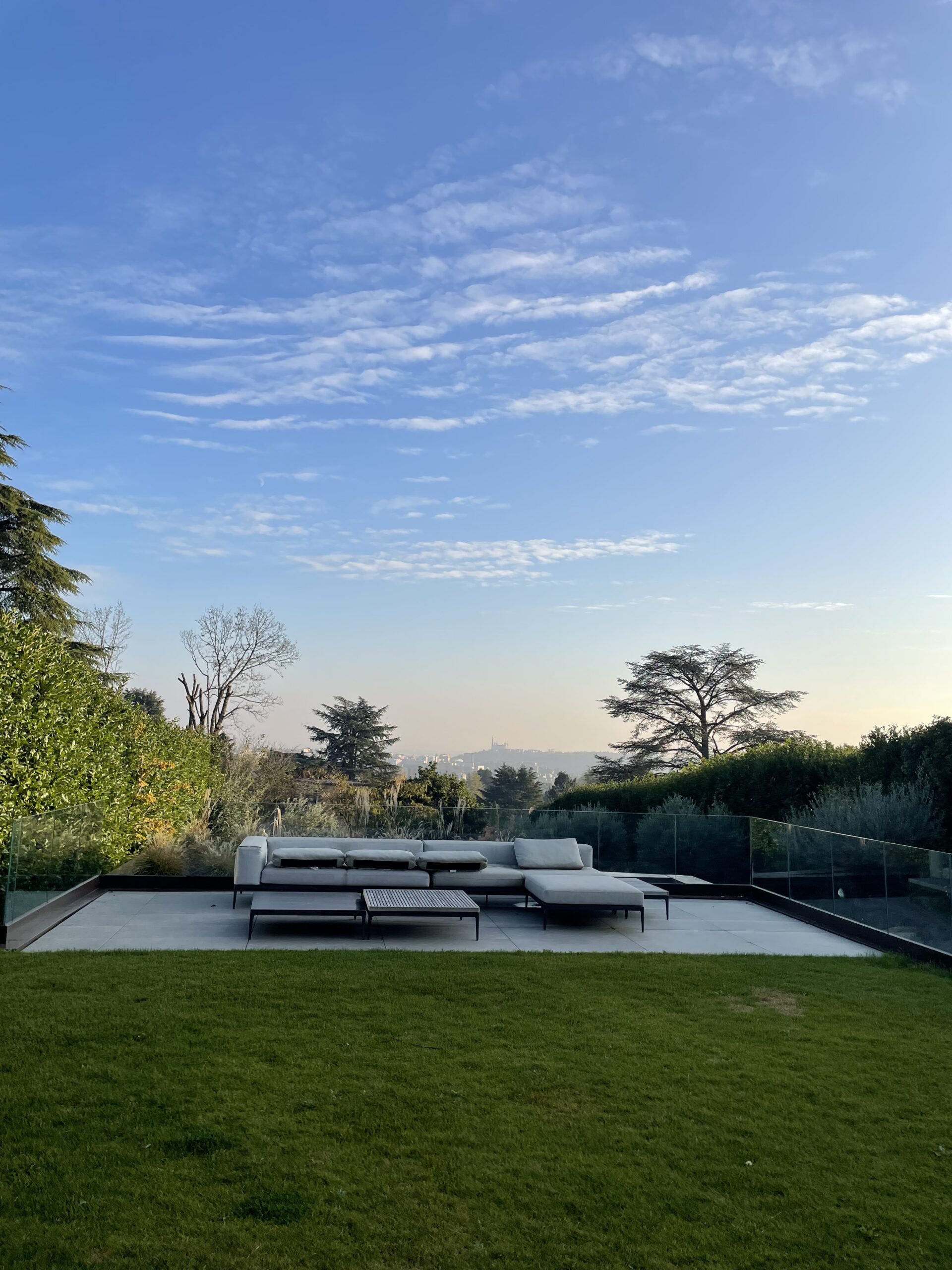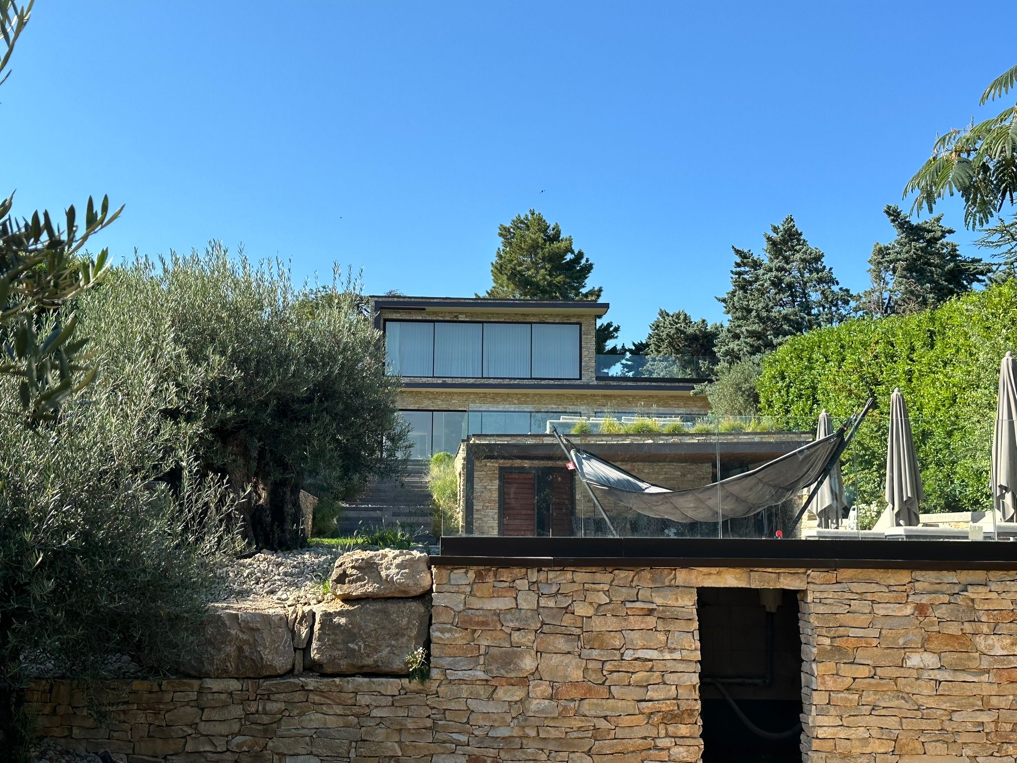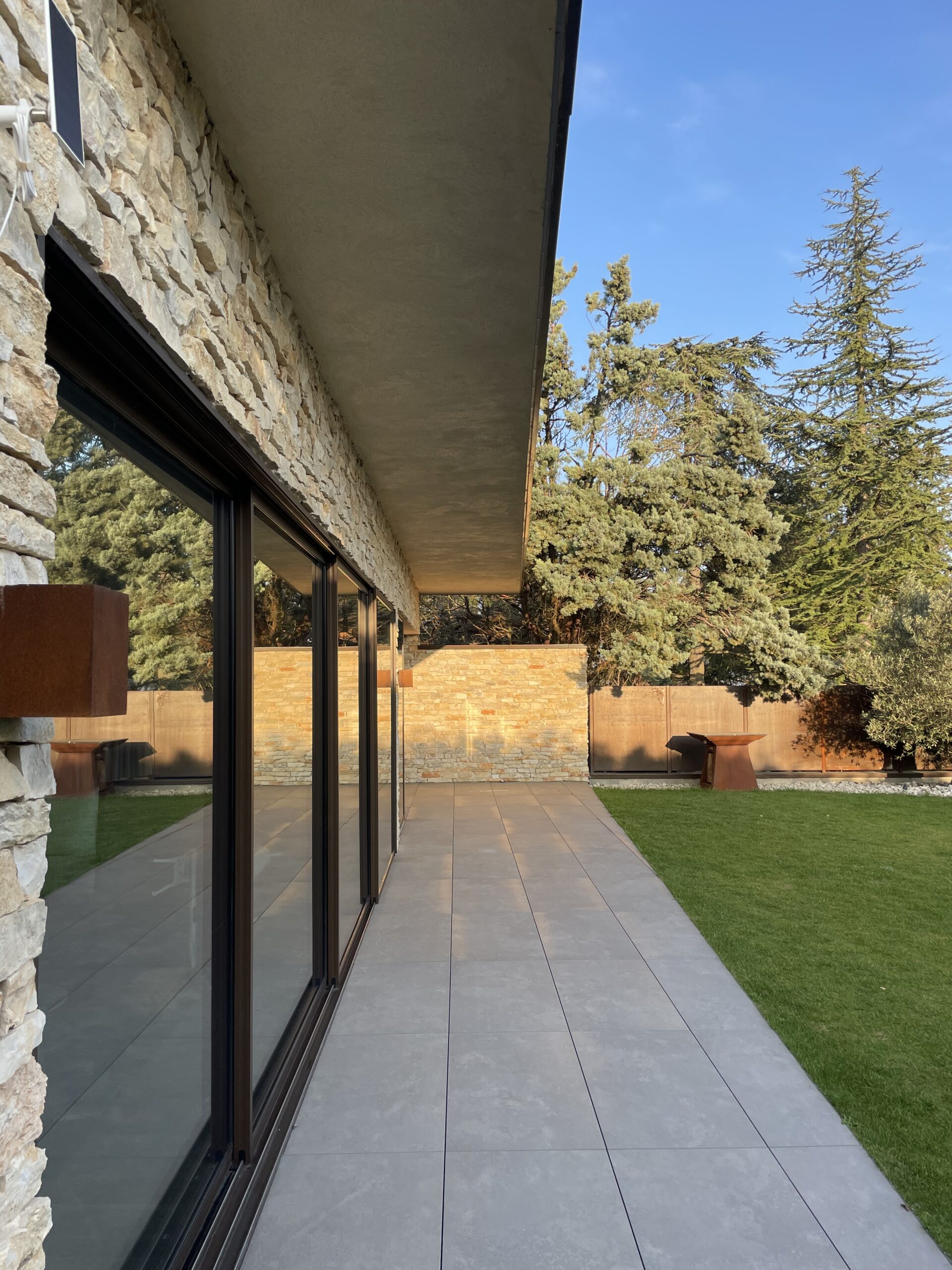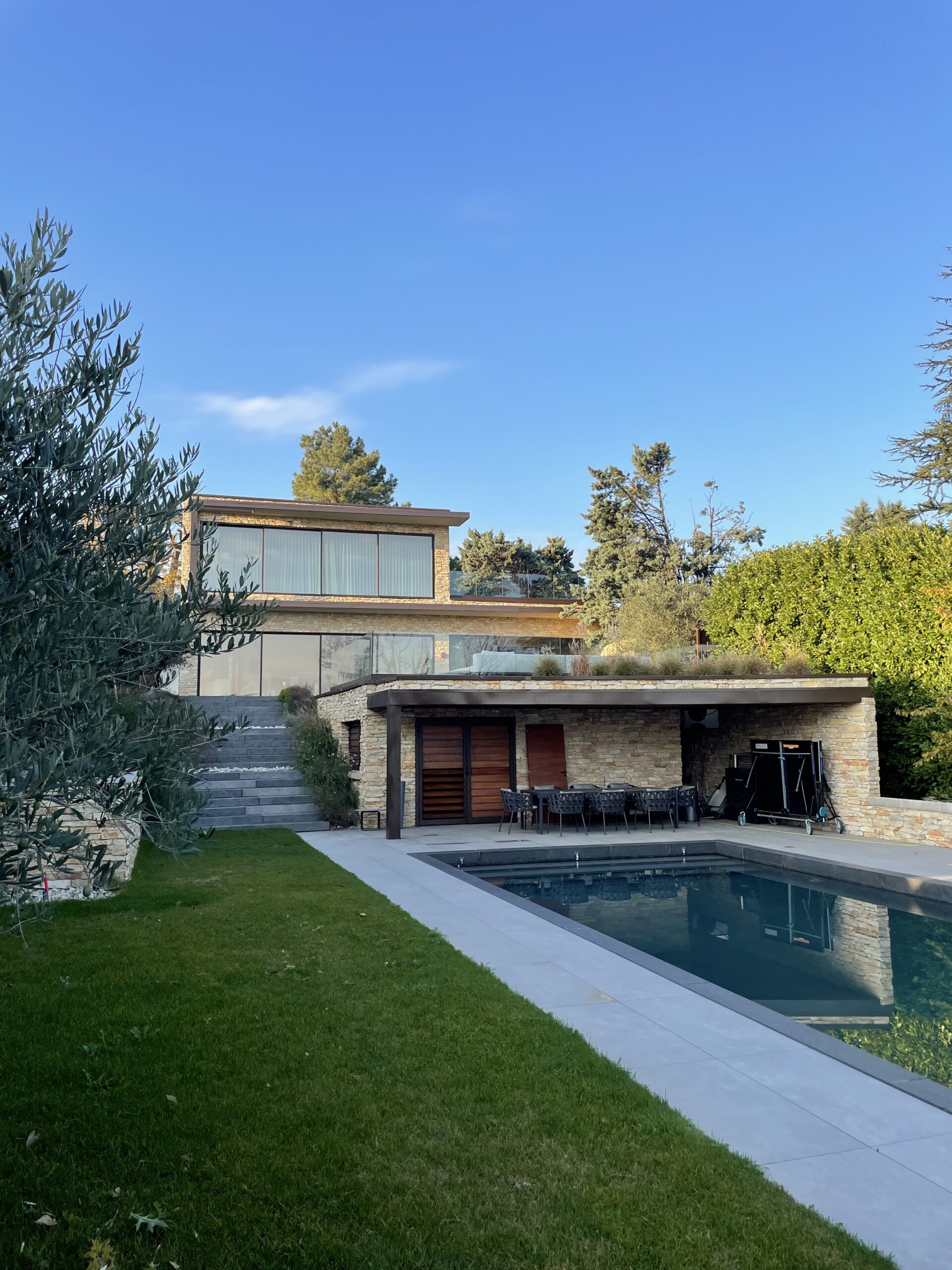 L’aménagement extérieur a été repensé avec la création d’un pool-house, un espace de vie supplémentaire qui se déploie autour de la piscine, renforçant ainsi la relation entre l’intérieur et l’extérieur. Les matériaux, tels que la pierre naturelle et le verre, ont été utilisés pour apporter une touche de modernité tout en s’intégrant harmonieusement dans le paysage.