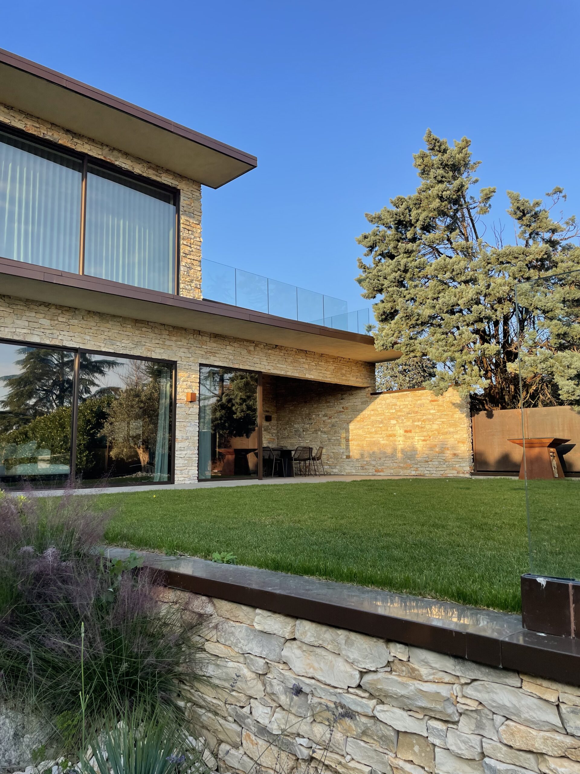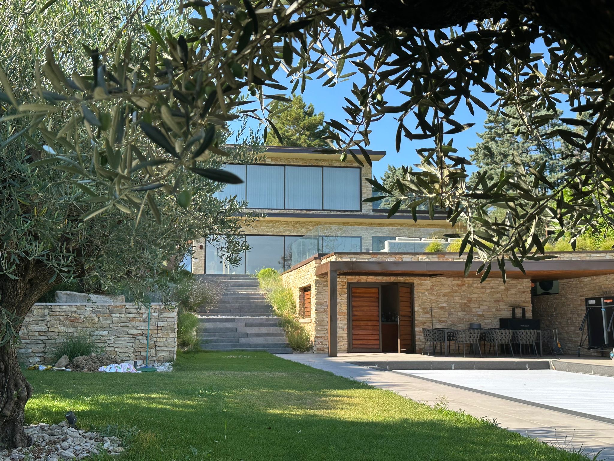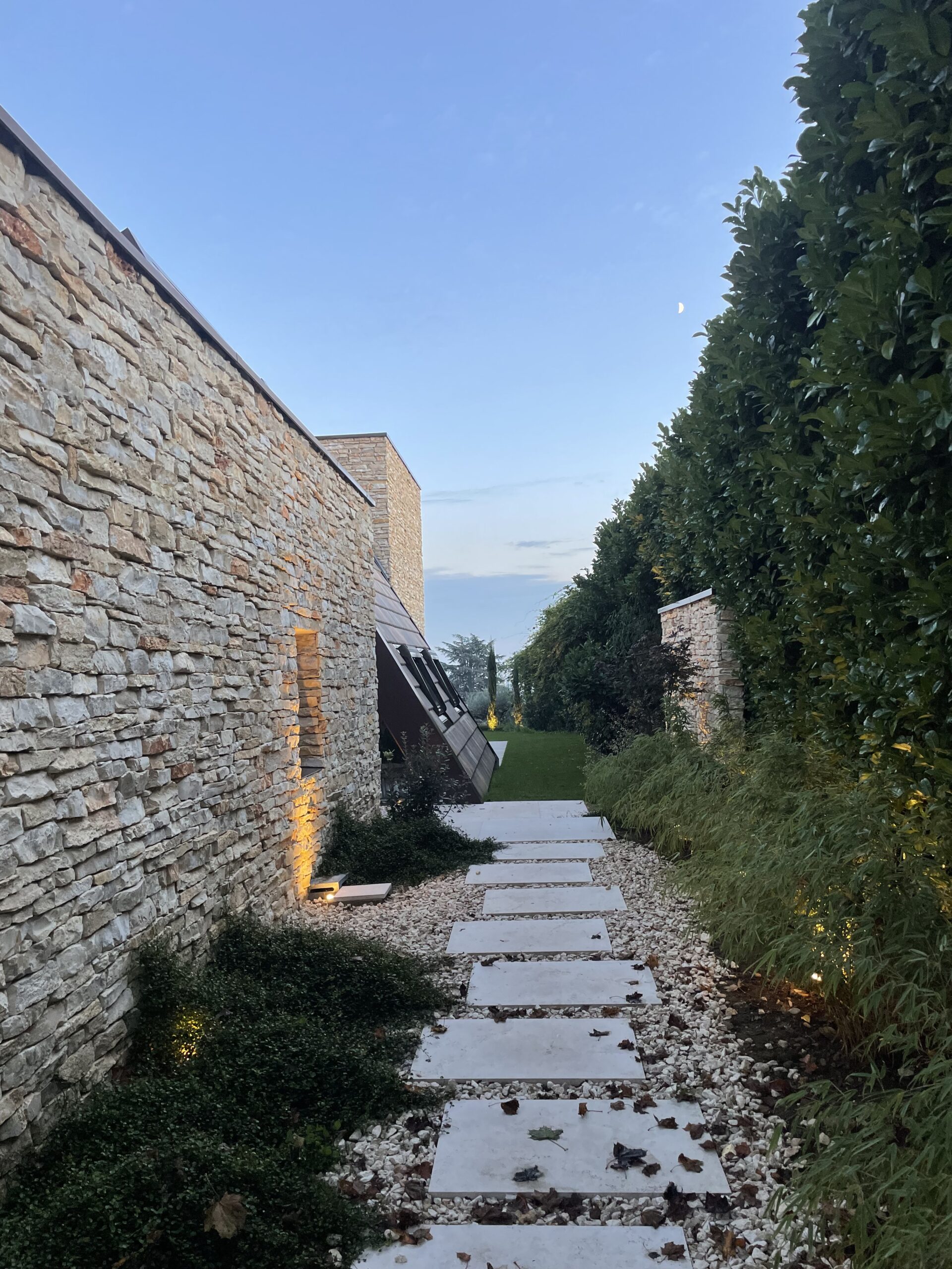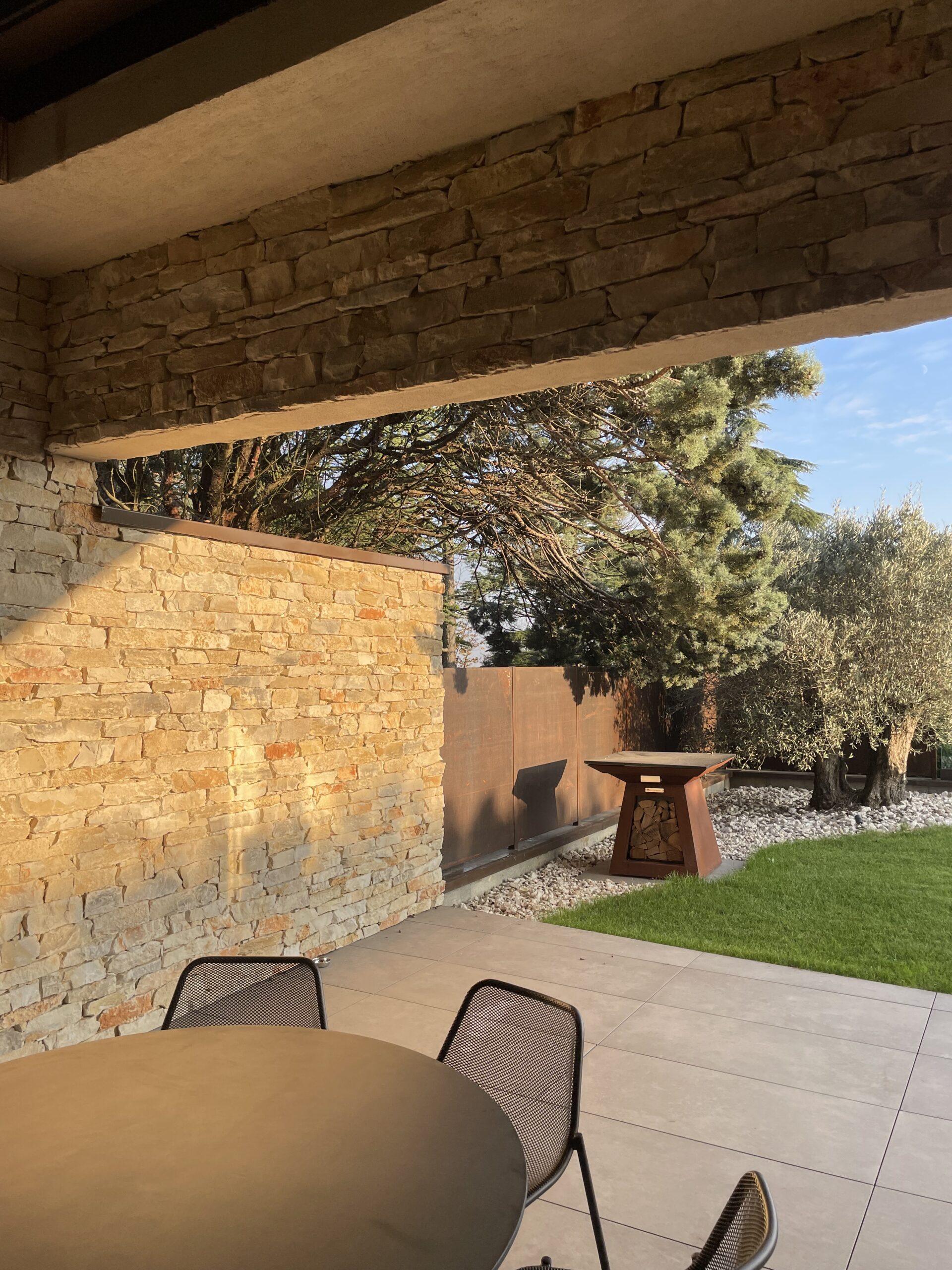 L’aménagement extérieur a été repensé avec la création d’un pool-house, un espace de vie supplémentaire qui se déploie autour de la piscine, renforçant ainsi la relation entre l’intérieur et l’extérieur. Les matériaux, tels que la pierre naturelle et le verre, ont été utilisés pour apporter une touche de modernité tout en s’intégrant harmonieusement dans le paysage.