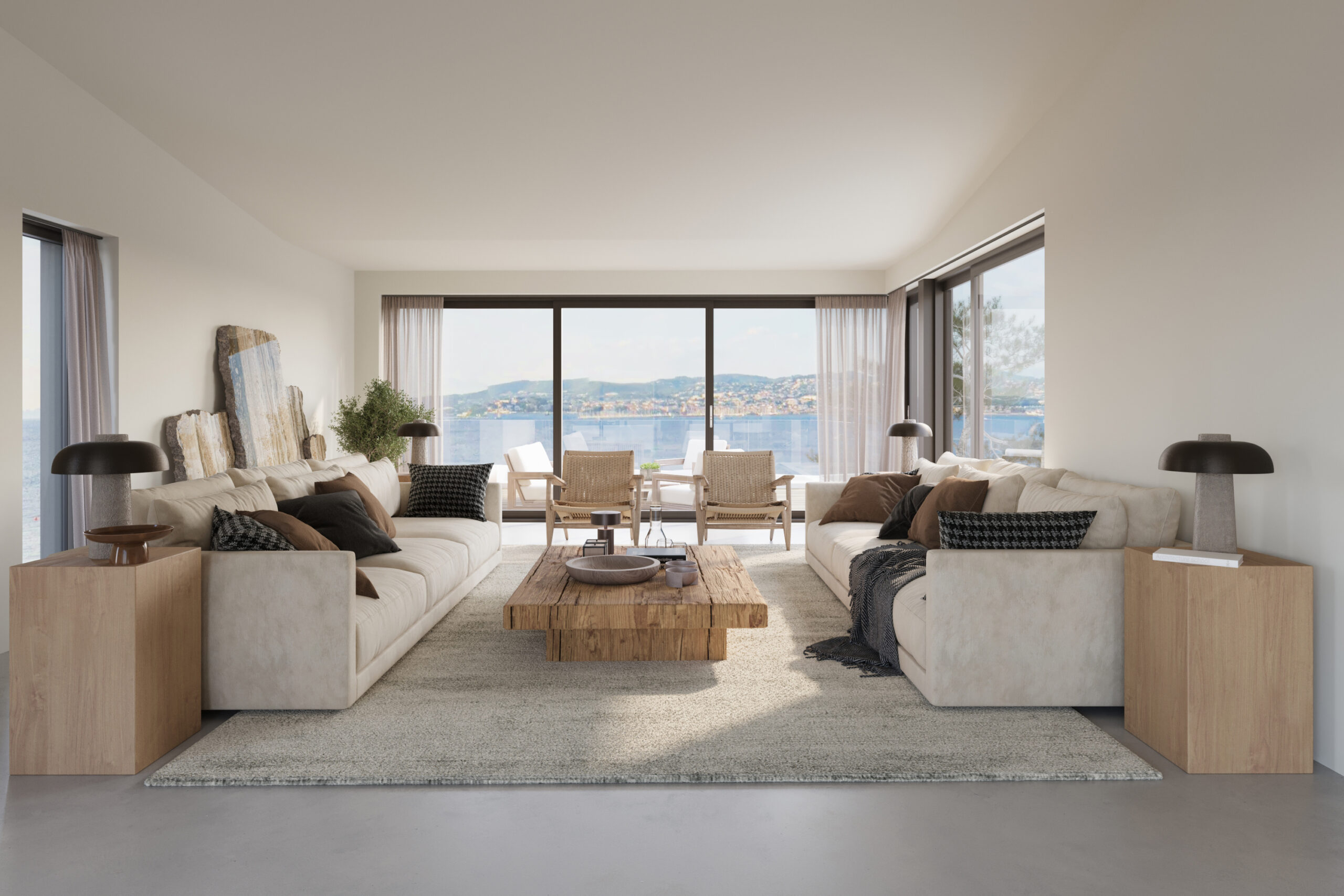 L’une des caractéristiques majeures de cette rénovation est la vue dégagée sur la mer, accessible à quelques pas de la maison. Les grandes baies vitrées, qui traversent les façades, offrent une ouverture totale sur le paysage, apportant une lumière naturelle. Les matériaux choisis pour l’extension, tels que la pierre naturelle, le béton et le verre, ont été intégrés avec soin pour s’harmoniser avec l’environnement naturel.
