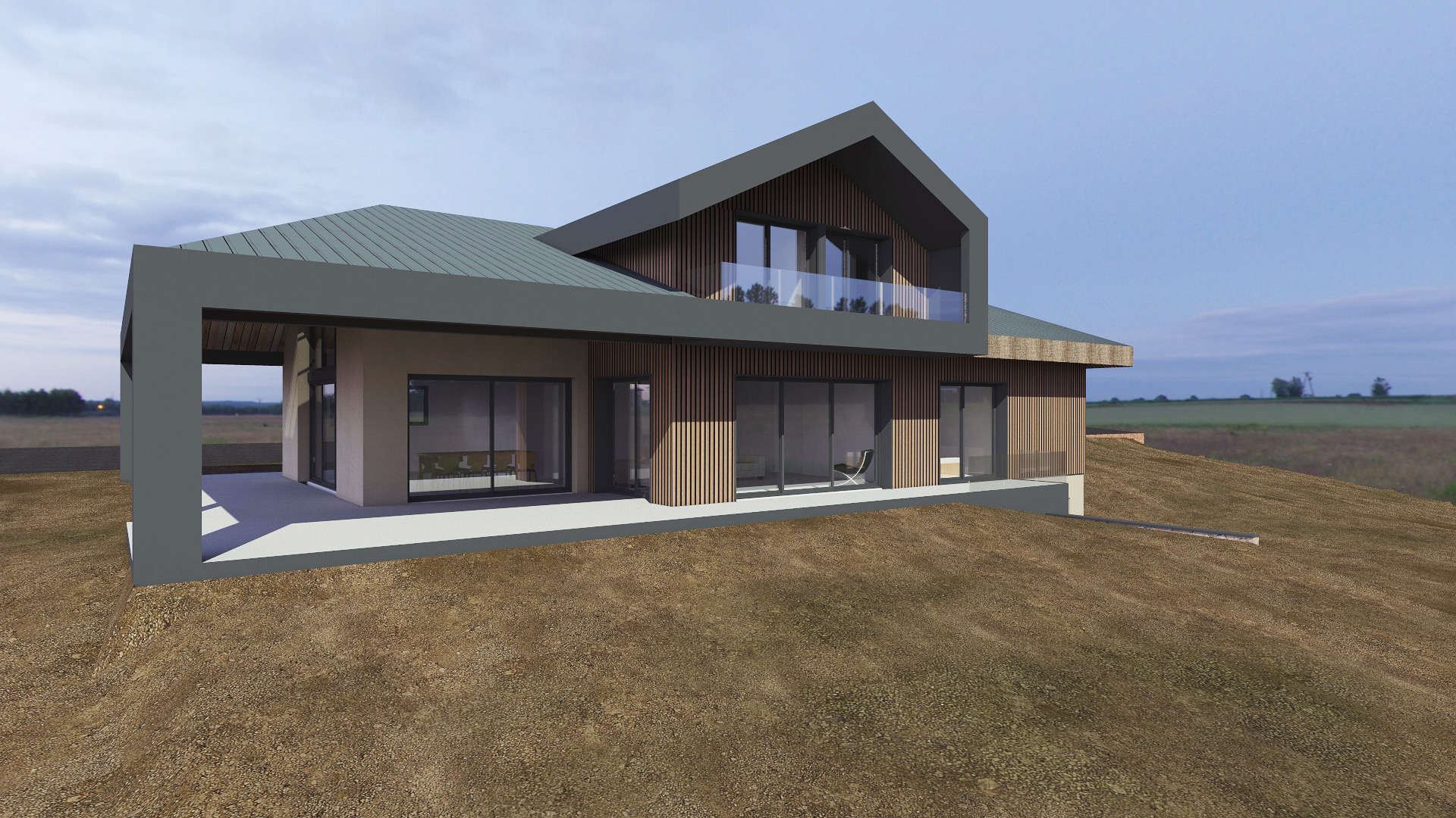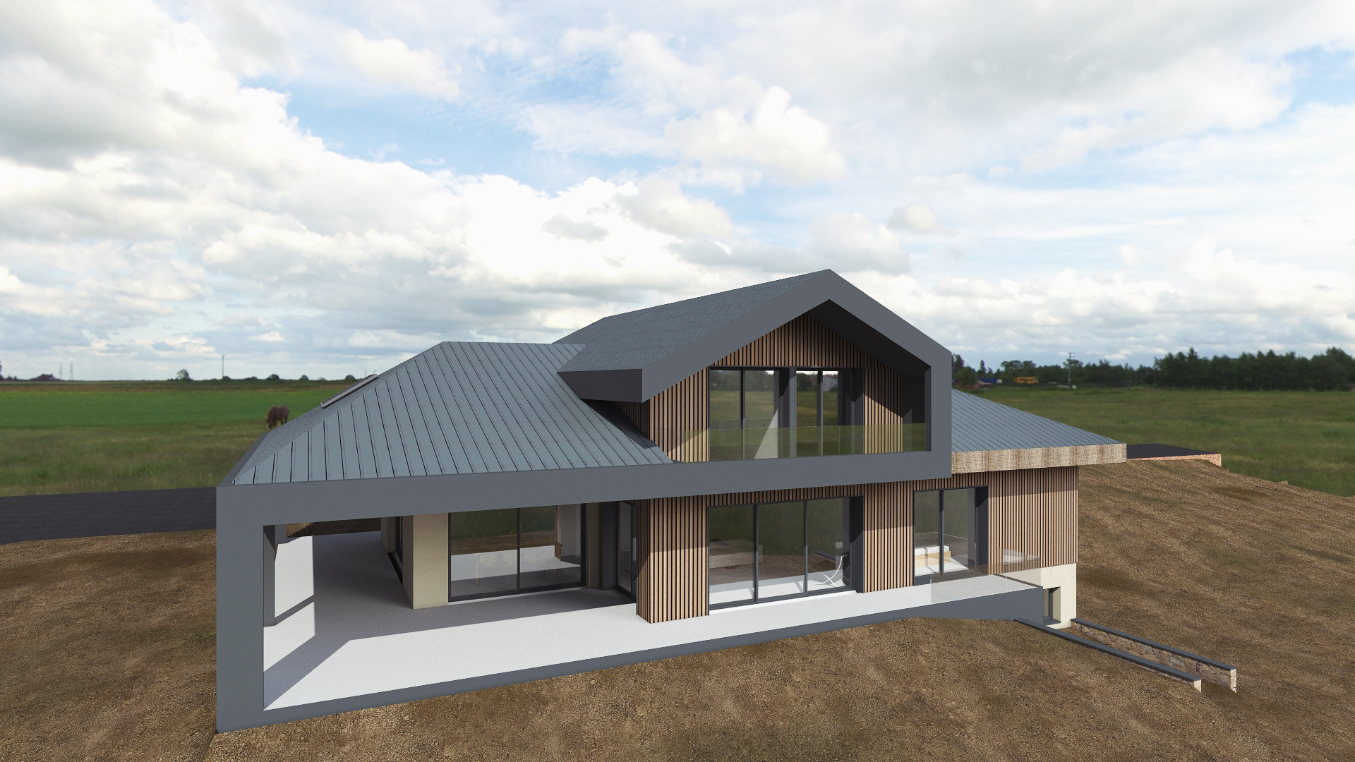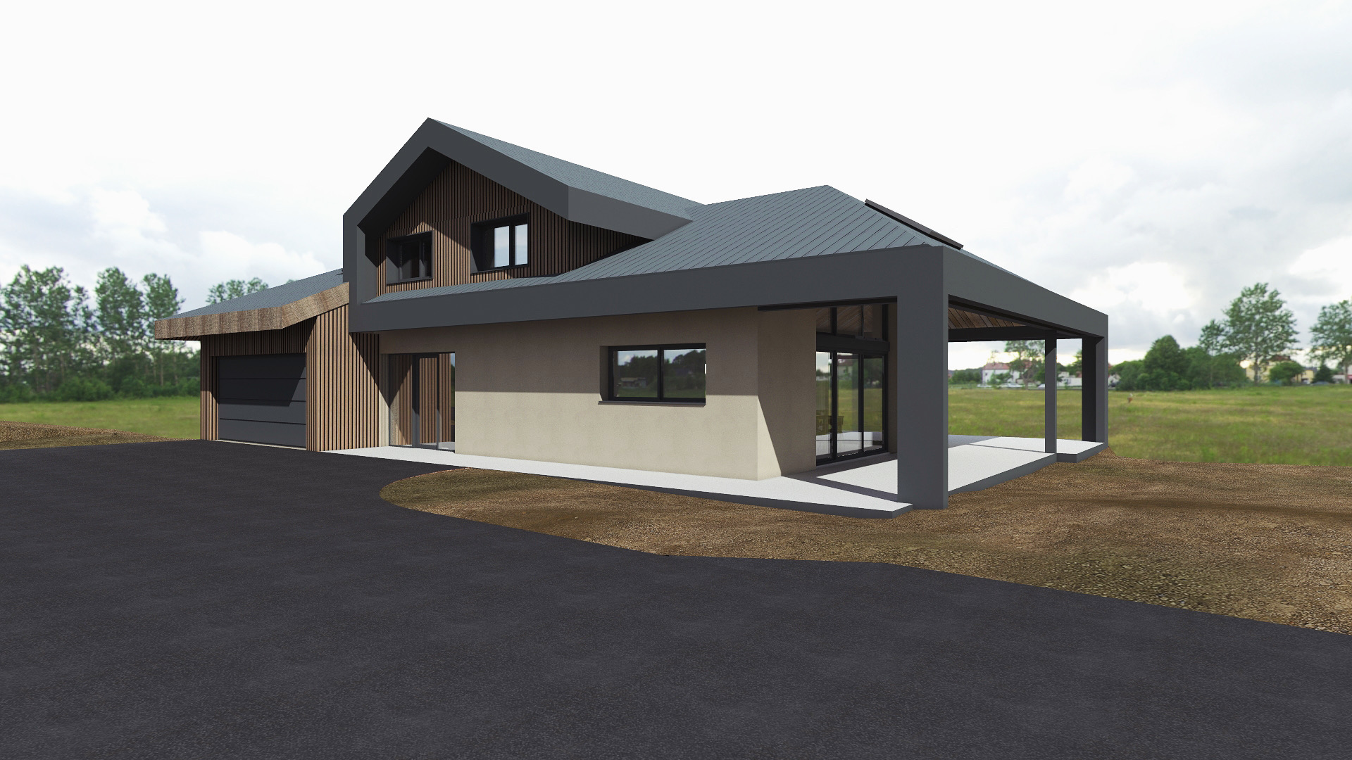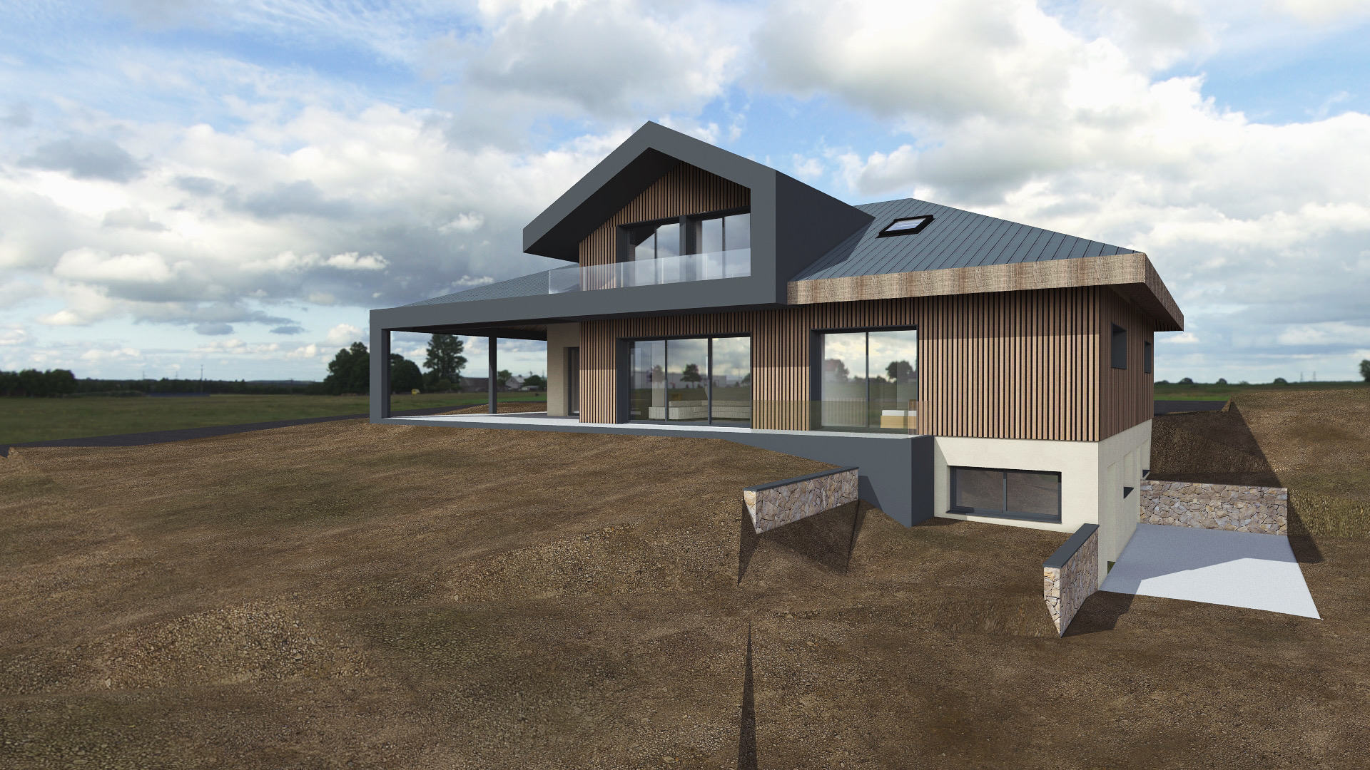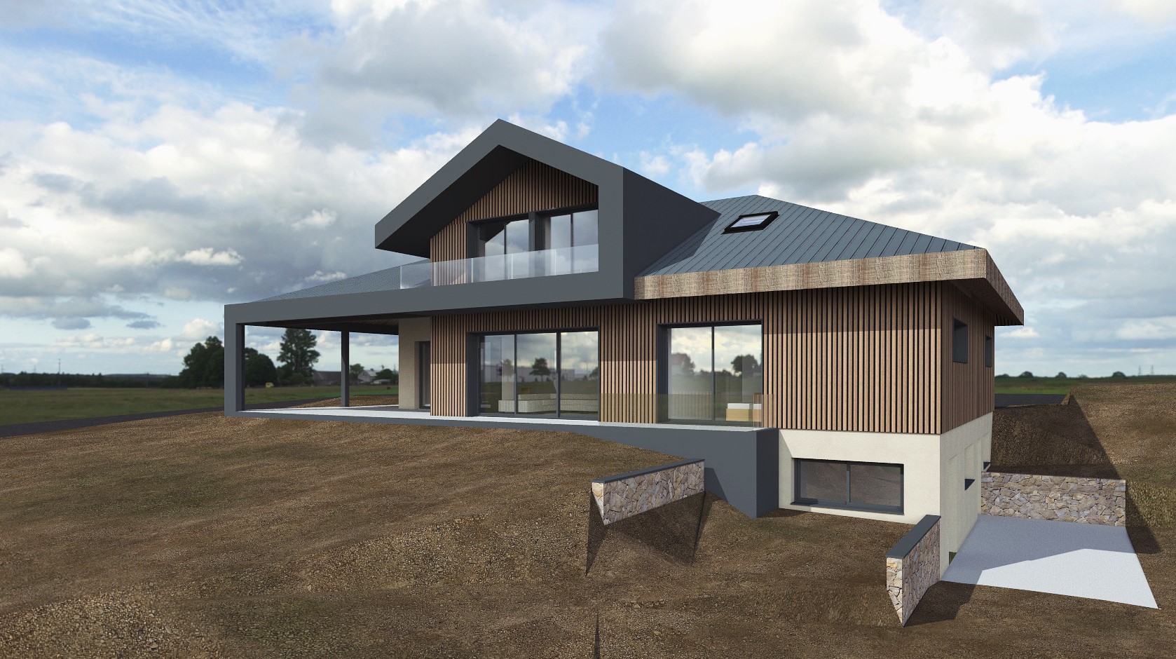 Ce projet architectural incarne l’équilibre subtil entre tradition et modernité. Il repose sur la mise en valeur de volumes complexes générés par des toitures à pentes multiples, réinterprétées avec une approche contemporaine. Le toit à double pente, emblématique de l’architecture locale, est revisité avec des lignes simples et épurées, apportant une identité résolument moderne à l’ensemble. Les grandes baies vitrées jouent un rôle central dans le design. Elles apportent de la lumière naturelle à l’intérieur et offrent une vue sur le paysage environnant.